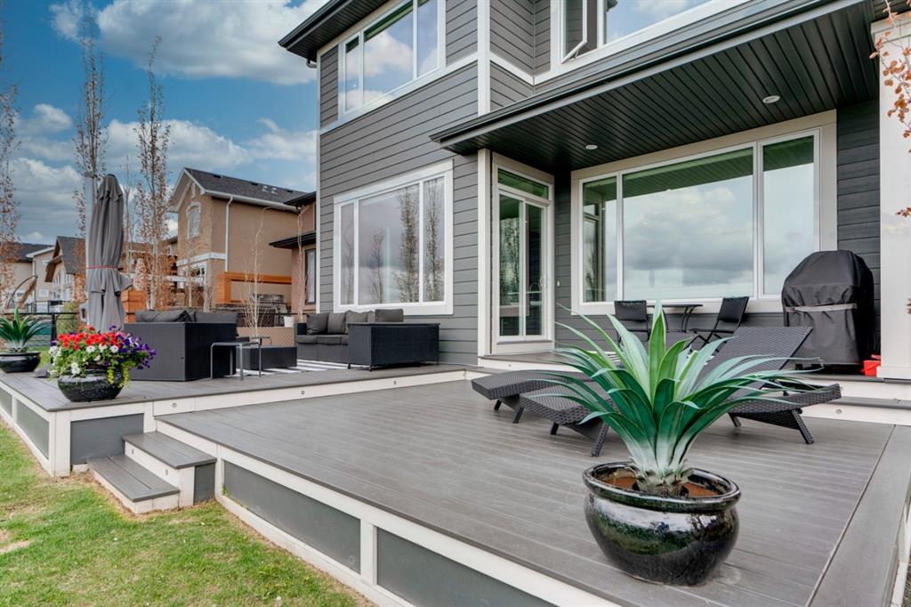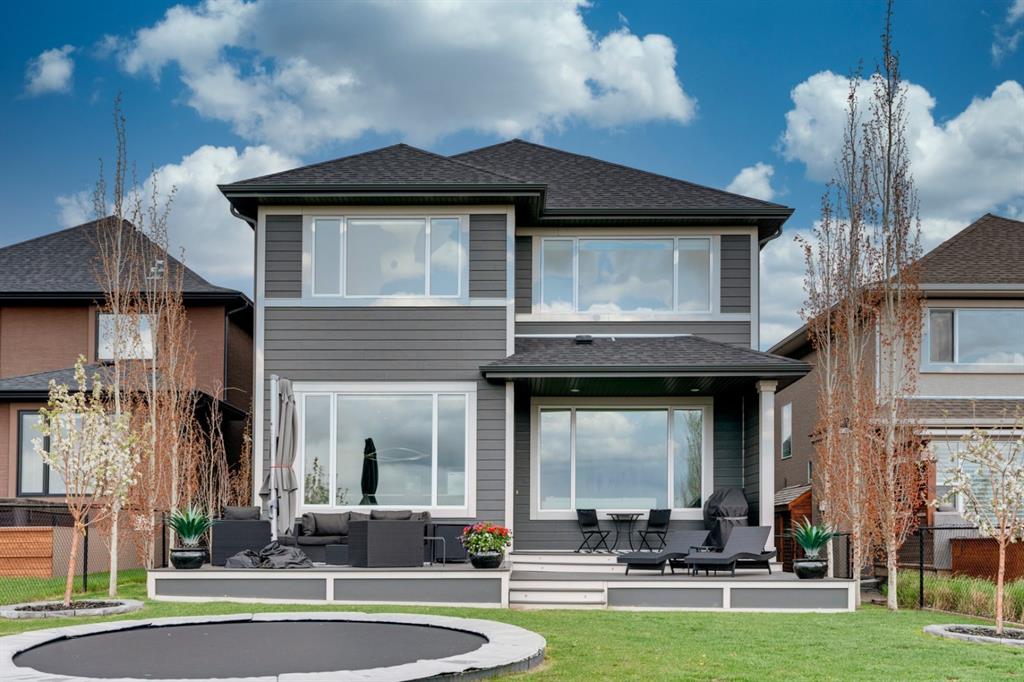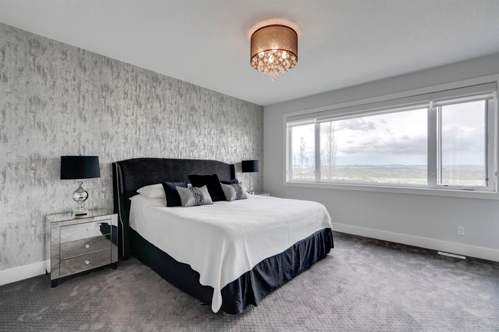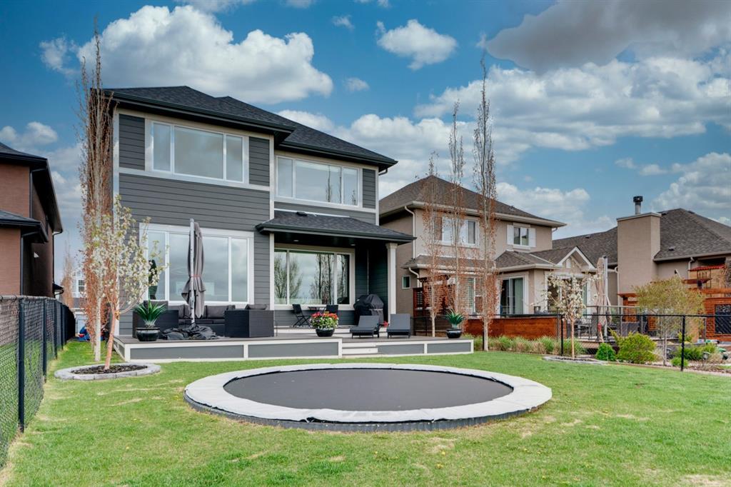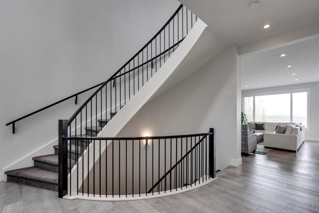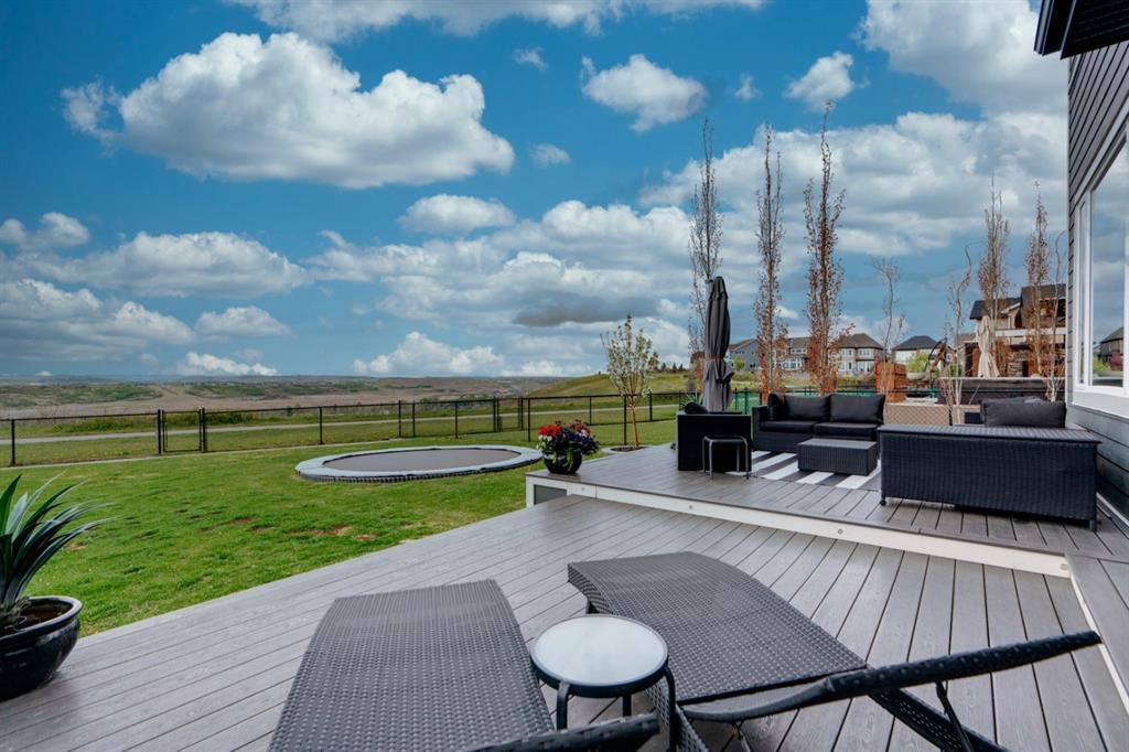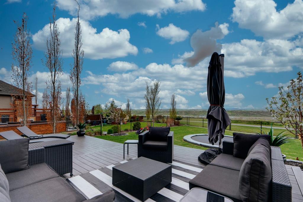 This exquisite luxury home sits perched on the gorgeous ridge of Cranston overlooking the river valley with panoramic mountain views. Enjoy sunshine filled days and stunning sunsets from your main floor walk-out home, moving from your indoor entertainment space to the outdoors seamlessly. The kids will adore the in-ground trampoline and you’ll appreciate the unobstructed view while they do! This custom home masterfully intertwines breathtaking natural surroundings with an abundance of windows paired with high quality, modern finishes. This architectural dream features a curved cat’s eye staircase as its centerpiece complimented by high ceilings and a stunning chandelier. Rustic wide planked hardwood floors lead from the entrance, past a functional mudroom with 5 lockers and a walk-in closet, a 2 pc bath and main floor office with built in stone desk, to the jaw dropping main living space with a wall of windows, chef’s kitchen with high-end appliances including induction stove, wall oven, steam oven, over-sized side-by-side fridge/freezer & even 2 dishwashers. Winding your way up to the master retreat where views for days impress. The ensuite includes a soaker tub, separate vanities, make-up desk and even a steam shower. The walk-in closet even has a built-in jewellery stand. Bedrooms 2 & 3 have walk-in closets & private ensuites. The bonus room is converted into a fabulous 4th bedroom. The convenience of an upper level laundry leaves nothing to be desired. The finished basement includes large recreation/media room, dedicated work out space, 5th bedroom & full bath. Additional interior features: blackout blinds in all bedrooms, hardwood with a 50 year warranty, Jenn Aire appliances, 8′ doors throughout, knockdown ceilings, 9′ ceilings in basement and upper floor, 10′ main floor, electric fireplace, floating vanities in all bathrooms, electrical in-floor heating in master & bedroom 2 ensuites, security system wired, 2 high efficiency furnaces with humidifiers, 2 hot water tanks, HEPA air filtration system, Kinetico water softener, built-in vacuum, central AC to upper floor, gas line to oversized garage with additional loft storage. Basement was professionally finished by the builder.Additional exterior features: hardy board, exposed aggregate border on driveway, triple glazed oversized windows, gas line to BBQ, quality Duradek and sunken trampoline.