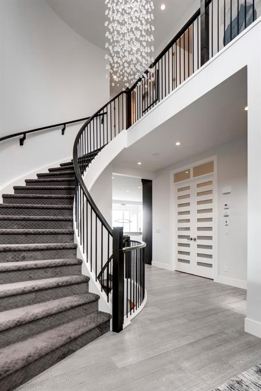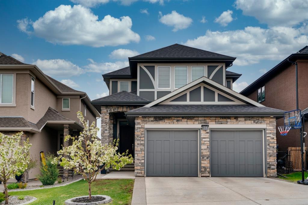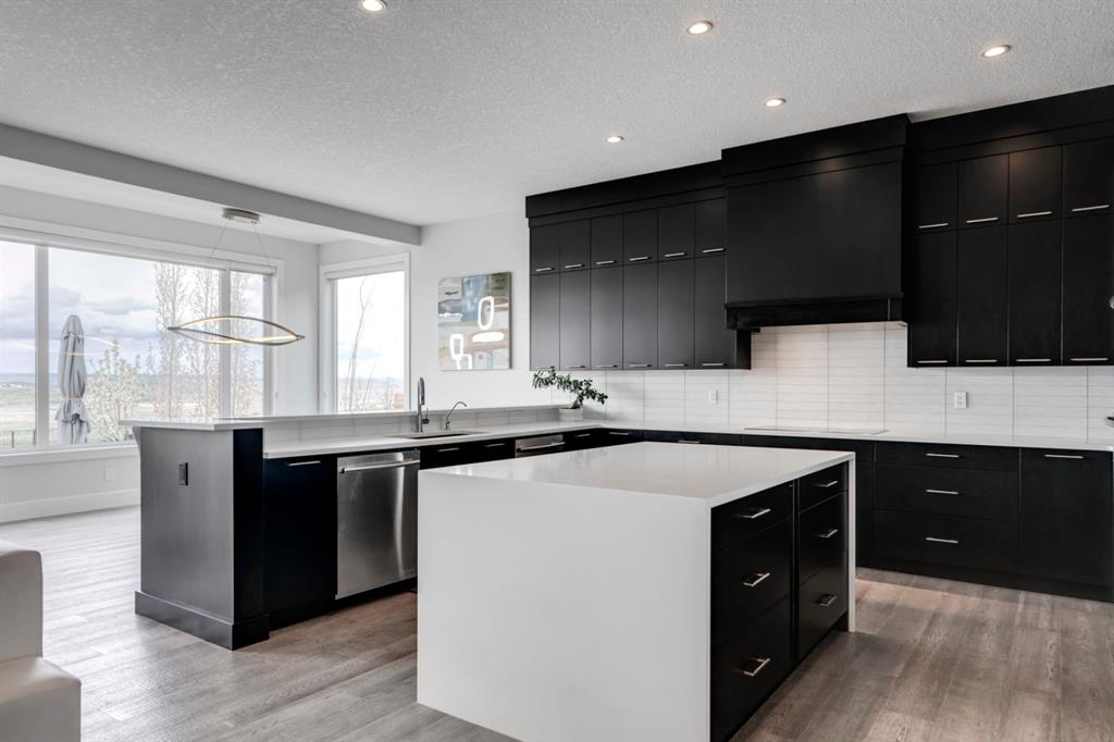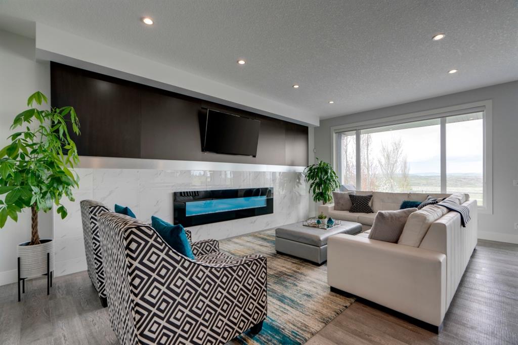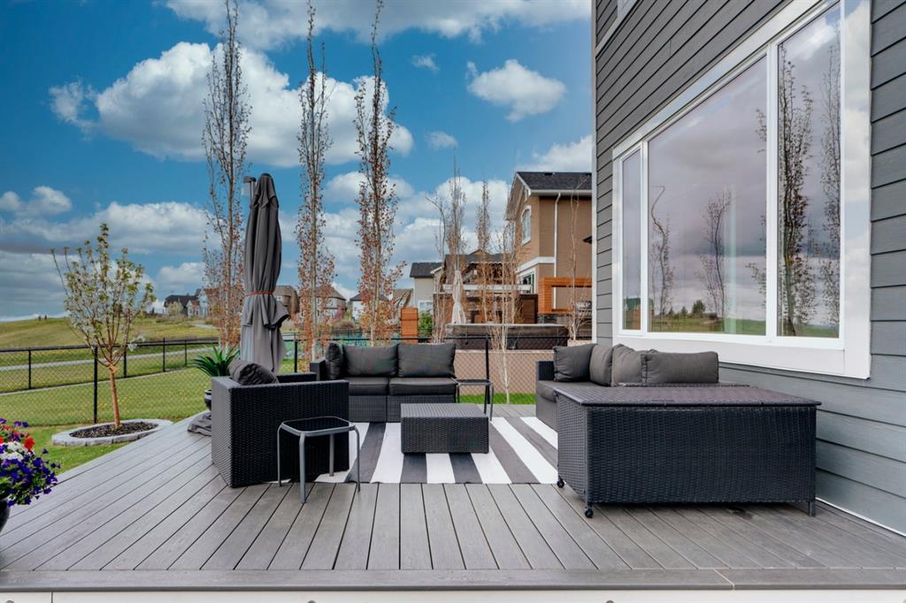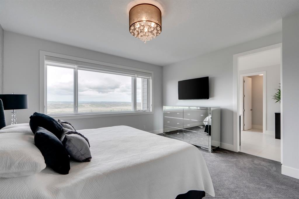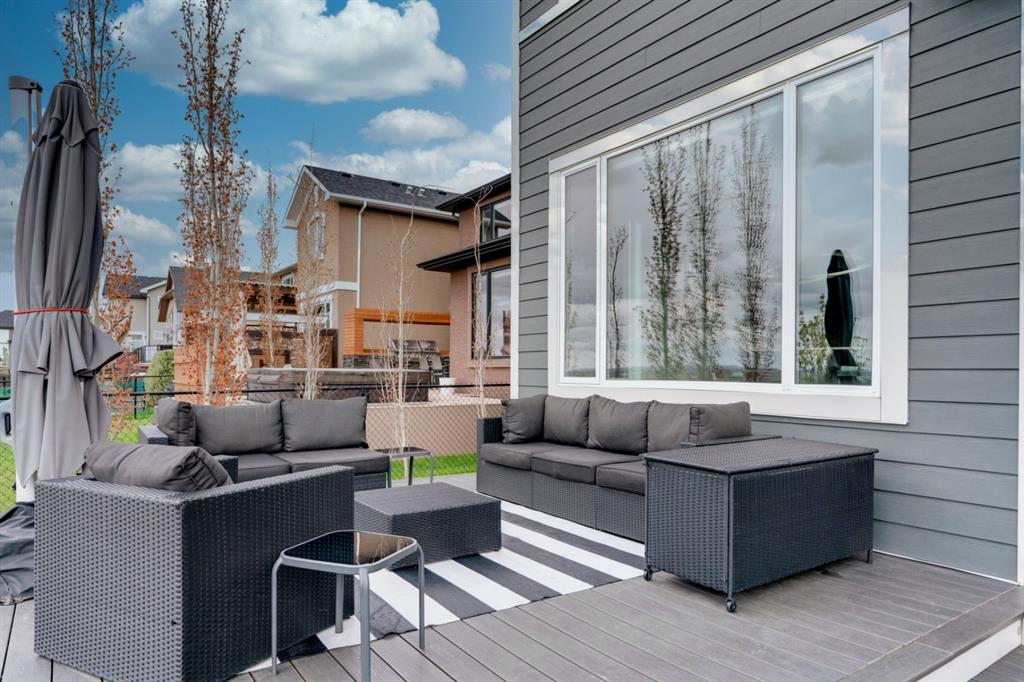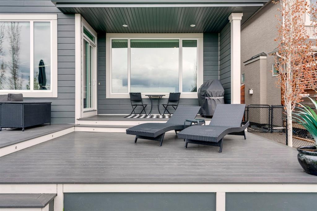 This exquisite luxury home sits perched on the gorgeous ridge of Cranston overlooking the river valley with panoramic mountain views. Enjoy sunshine filled days and stunning sunsets from your main floor walk-out home, moving from your indoor entertainment space to the outdoors seamlessly. The kids will adore the in-ground trampoline and you’ll appreciate the unobstructed view while they do! This custom home masterfully intertwines breathtaking natural surroundings with an abundance of windows paired with high quality, modern finishes. This architectural dream features a curved cat’s eye staircase as its centerpiece complimented by high ceilings and a stunning chandelier. Rustic wide planked hardwood floors lead from the entrance, past a functional mudroom with 5 lockers and a walk-in closet, a 2 pc bath and main floor office with built in stone desk, to the jaw dropping main living space with a wall of windows, chef’s kitchen with high-end appliances including induction stove, wall oven, steam oven, over-sized side-by-side fridge/freezer & even 2 dishwashers. Winding your way up to the master retreat where views for days impress. The ensuite includes a soaker tub, separate vanities, make-up desk and even a steam shower. The walk-in closet even has a built-in jewellery stand. Bedrooms 2 & 3 have walk-in closets & private ensuites. The bonus room is converted into a fabulous 4th bedroom. The convenience of an upper level laundry leaves nothing to be desired. The finished basement includes large recreation/media room, dedicated work out space, 5th bedroom & full bath. Additional interior features: blackout blinds in all bedrooms, hardwood with a 50 year warranty, Jenn Aire appliances, 8′ doors throughout, knockdown ceilings, 9′ ceilings in basement and upper floor, 10′ main floor, electric fireplace, floating vanities in all bathrooms, electrical in-floor heating in master & bedroom 2 ensuites, security system wired, 2 high efficiency furnaces with humidifiers, 2 hot water tanks, HEPA air filtration system, Kinetico water softener, built-in vacuum, central AC to upper floor, gas line to oversized garage with additional loft storage. Basement was professionally finished by the builder.Additional exterior features: hardy board, exposed aggregate border on driveway, triple glazed oversized windows, gas line to BBQ, quality Duradek and sunken trampoline.