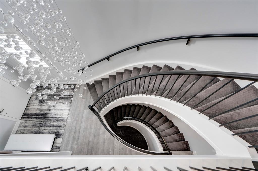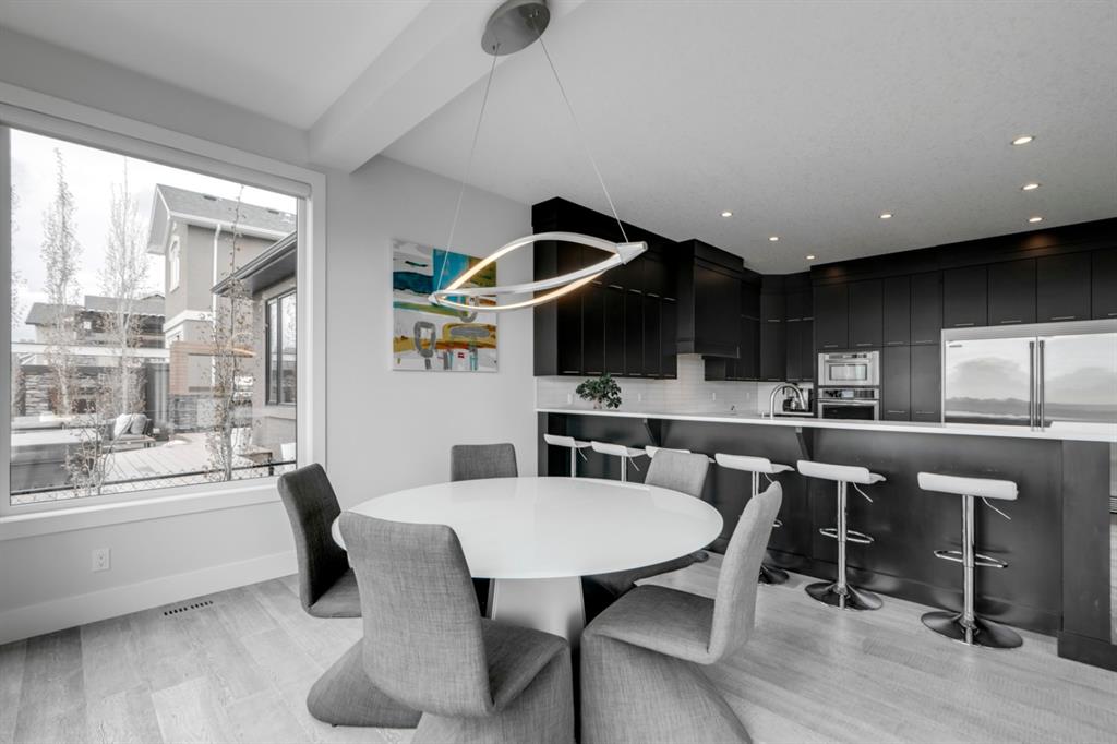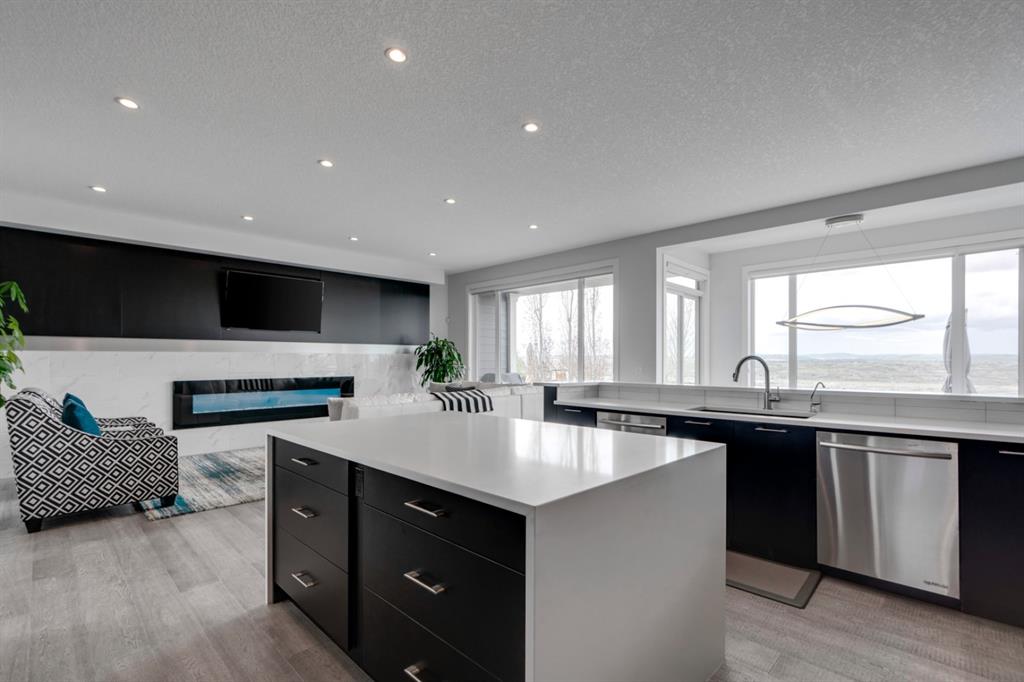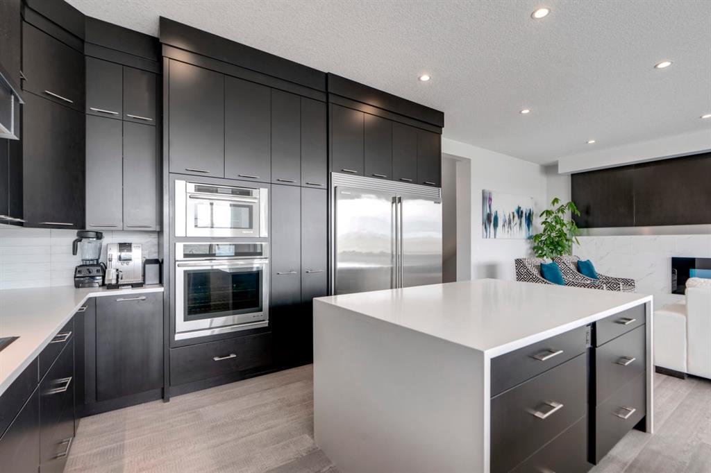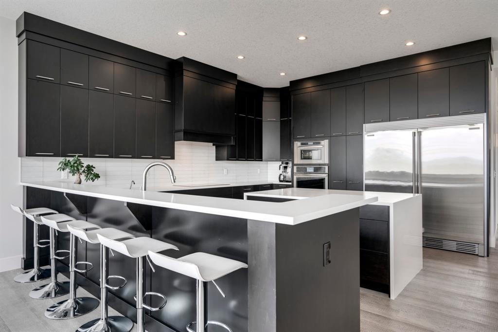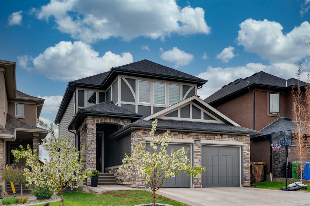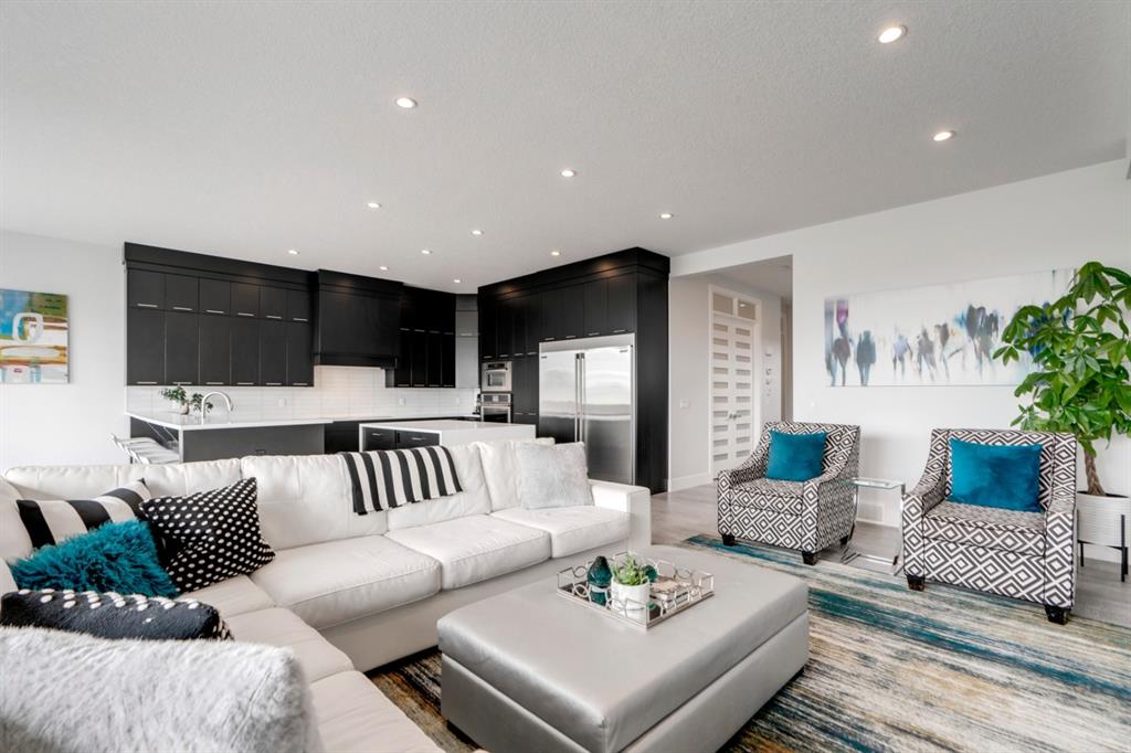 This exquisite luxury home sits perched on the gorgeous ridge of Cranston overlooking the river valley with panoramic mountain views. Enjoy sunshine filled days and stunning sunsets from your main floor walk-out home, moving from your indoor entertainment space to the outdoors seamlessly. The kids will adore the in-ground trampoline and you’ll appreciate the unobstructed view while they do! This custom home masterfully intertwines breathtaking natural surroundings with an abundance of windows paired with high quality, modern finishes. This architectural dream features a curved cat’s eye staircase as its centerpiece complimented by high ceilings and a stunning chandelier. Rustic wide planked hardwood floors lead from the entrance, past a functional mudroom with 5 lockers and a walk-in closet, a 2 pc bath and main floor office with built in stone desk, to the jaw dropping main living space with a wall of windows, chef’s kitchen with high-end appliances including induction stove, wall oven, steam oven, over-sized side-by-side fridge/freezer & even 2 dishwashers. Winding your way up to the master retreat where views for days impress. The ensuite includes a soaker tub, separate vanities, make-up desk and even a steam shower. The walk-in closet even has a built-in jewellery stand. Bedrooms 2 & 3 have walk-in closets & private ensuites. The bonus room is converted into a fabulous 4th bedroom. The convenience of an upper level laundry leaves nothing to be desired. The finished basement includes large recreation/media room, dedicated work out space, 5th bedroom & full bath. Additional interior features: blackout blinds in all bedrooms, hardwood with a 50 year warranty, Jenn Aire appliances, 8′ doors throughout, knockdown ceilings, 9′ ceilings in basement and upper floor, 10′ main floor, electric fireplace, floating vanities in all bathrooms, electrical in-floor heating in master & bedroom 2 ensuites, security system wired, 2 high efficiency furnaces with humidifiers, 2 hot water tanks, HEPA air filtration system, Kinetico water softener, built-in vacuum, central AC to upper floor, gas line to oversized garage with additional loft storage. Basement was professionally finished by the builder.Additional exterior features: hardy board, exposed aggregate border on driveway, triple glazed oversized windows, gas line to BBQ, quality Duradek and sunken trampoline.