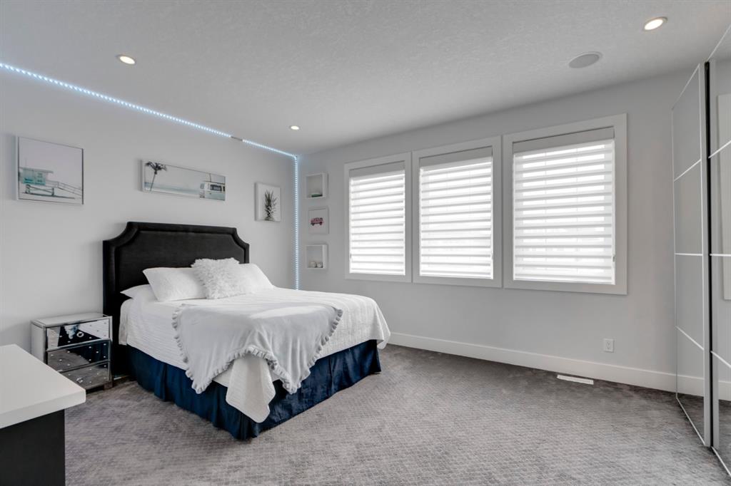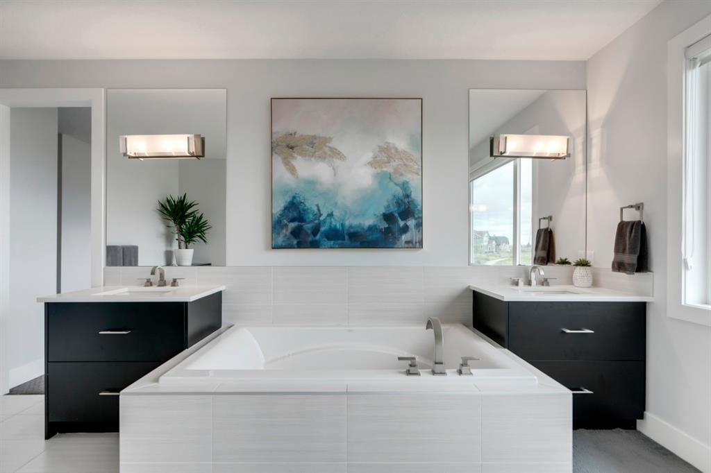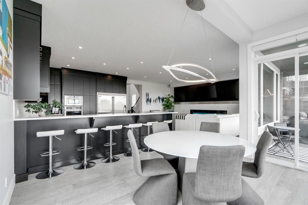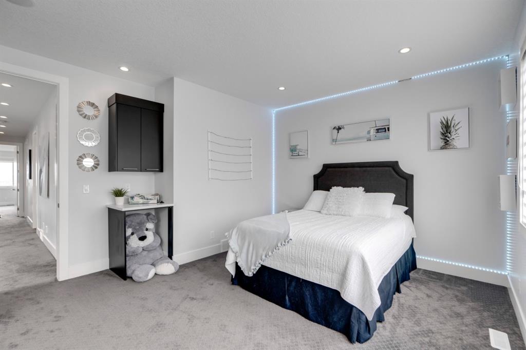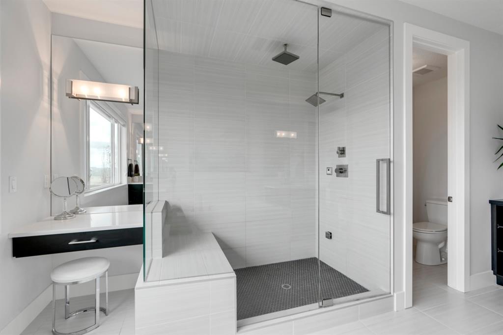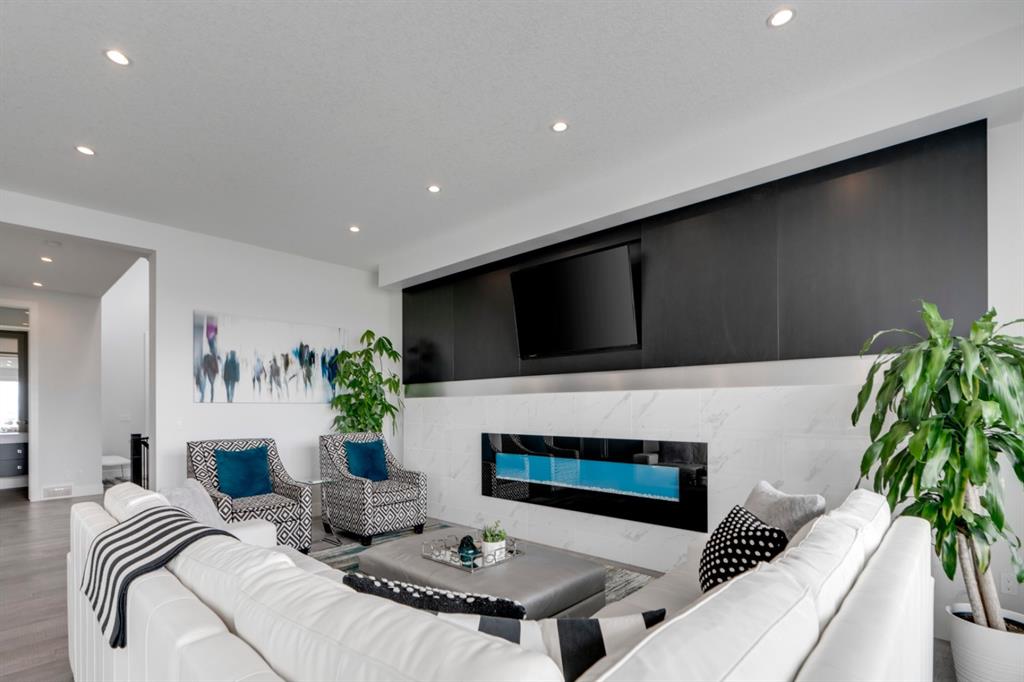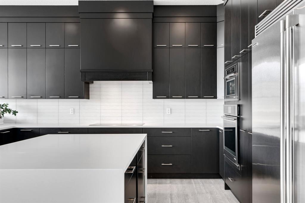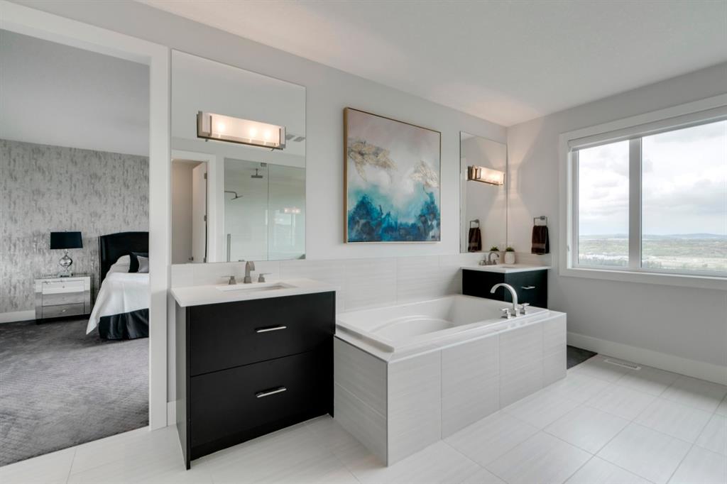 This exquisite luxury home sits perched on the gorgeous ridge of Cranston overlooking the river valley with panoramic mountain views. Enjoy sunshine filled days and stunning sunsets from your main floor walk-out home, moving from your indoor entertainment space to the outdoors seamlessly. The kids will adore the in-ground trampoline and you’ll appreciate the unobstructed view while they do! This custom home masterfully intertwines breathtaking natural surroundings with an abundance of windows paired with high quality, modern finishes. This architectural dream features a curved cat’s eye staircase as its centerpiece complimented by high ceilings and a stunning chandelier. Rustic wide planked hardwood floors lead from the entrance, past a functional mudroom with 5 lockers and a walk-in closet, a 2 pc bath and main floor office with built in stone desk, to the jaw dropping main living space with a wall of windows, chef’s kitchen with high-end appliances including induction stove, wall oven, steam oven, over-sized side-by-side fridge/freezer & even 2 dishwashers. Winding your way up to the master retreat where views for days impress. The ensuite includes a soaker tub, separate vanities, make-up desk and even a steam shower. The walk-in closet even has a built-in jewellery stand. Bedrooms 2 & 3 have walk-in closets & private ensuites. The bonus room is converted into a fabulous 4th bedroom. The convenience of an upper level laundry leaves nothing to be desired. The finished basement includes large recreation/media room, dedicated work out space, 5th bedroom & full bath. Additional interior features: blackout blinds in all bedrooms, hardwood with a 50 year warranty, Jenn Aire appliances, 8′ doors throughout, knockdown ceilings, 9′ ceilings in basement and upper floor, 10′ main floor, electric fireplace, floating vanities in all bathrooms, electrical in-floor heating in master & bedroom 2 ensuites, security system wired, 2 high efficiency furnaces with humidifiers, 2 hot water tanks, HEPA air filtration system, Kinetico water softener, built-in vacuum, central AC to upper floor, gas line to oversized garage with additional loft storage. Basement was professionally finished by the builder.Additional exterior features: hardy board, exposed aggregate border on driveway, triple glazed oversized windows, gas line to BBQ, quality Duradek and sunken trampoline.